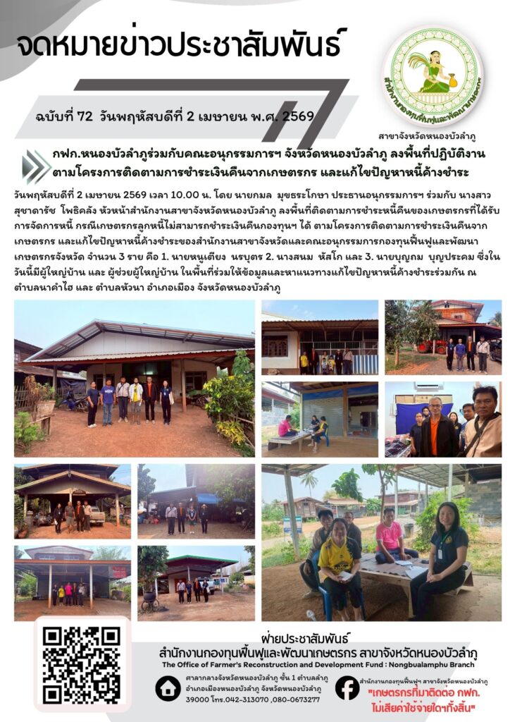 - ฉบับที่ 72 กฟก.หนองบัวลำภูร่วมกับคณะอนุกรรมการฯ จังหวัดหนองบัวลำภู ลงพื้นที่ปฏิบัติงานตามโครงการติดตามการชำระเงินคืนจากเกษตรกร และแก้ไขปัญหาหนี้ค้างชำระ