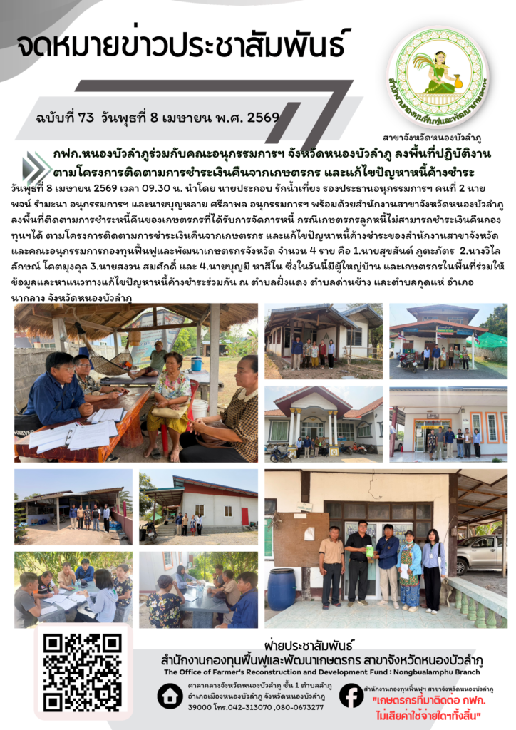 ฉบับที่ 73 กฟก.หนองบัวลำภูร่วมกับคณะอนุกรรมการฯ จังหวัดหนองบัวลำภู ลงพื้นที่ปฏิบัติงานตามโครงการติดตามการชำระเงินคืนจากเกษตรกร และแก้ไขปัญหาหนี้ค้างชำระ
